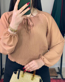 بلوز زنانه پلیسهدار با طراحی ظریف و مدرن که ترکیب پلیسههای عمودی و آستینهای پفی، ظاهری شیک و متعادل به استایل شما میبخشد.