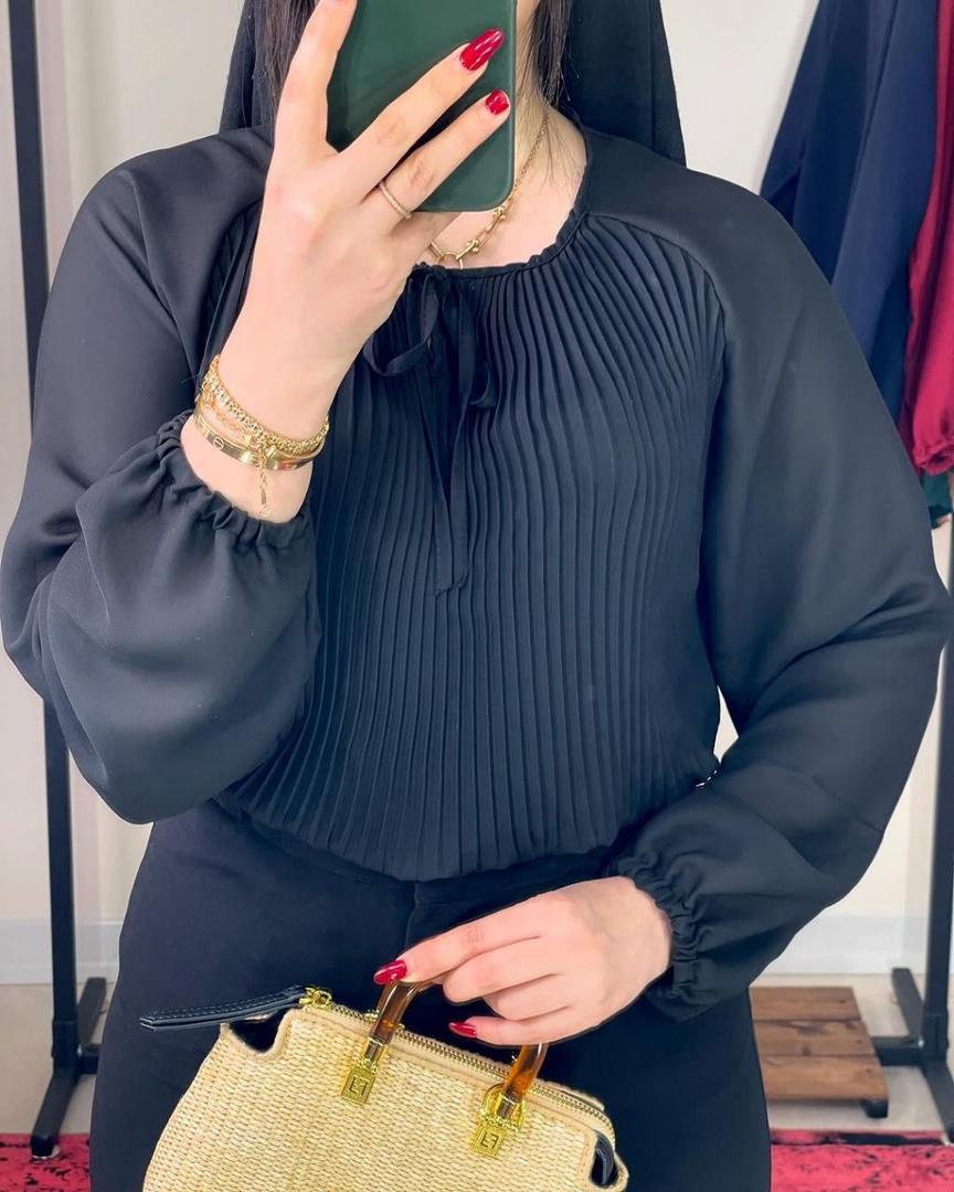 بلوز زنانه پلیسهدار با طراحی ظریف و مدرن که ترکیب پلیسههای عمودی و آستینهای پفی، ظاهری شیک و متعادل به استایل شما میبخشد.