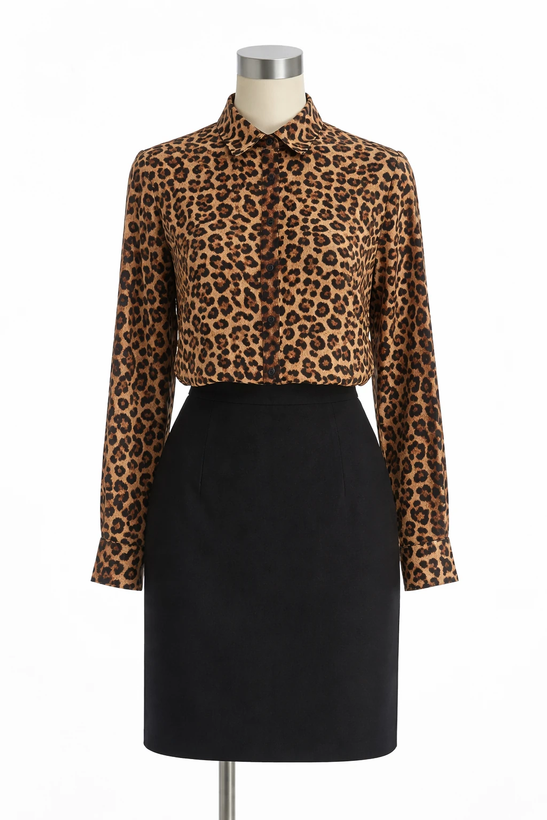 شومیز زنانه با طرح پلنگی مدرن، طراحیشده برای استایلهای خاص، جسور و متفاوت. ترکیب رنگ قهوهای گرم و مشکی در کنار الگوی پلنگی، جلوهای شیک و ترندی ایجاد کرده که برای استفاده روزمره، دورهمی و استایل نیمهرسمی کاملاً مناسب است.