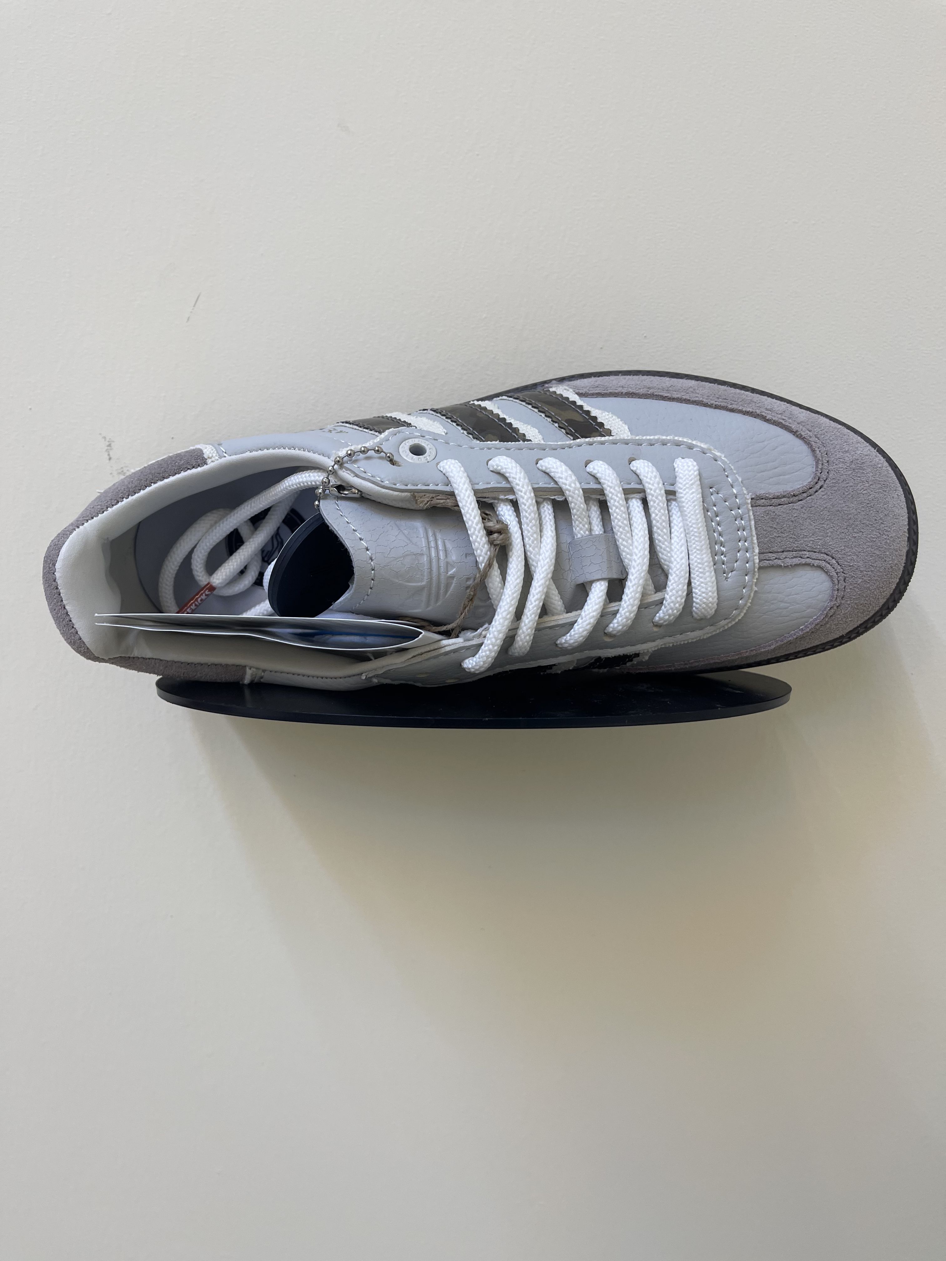 Grey / White / Olive Detail Premium Sneakersکفش اسپرت با ترکیب طوسی روشن و سفید، همراه با جزئیات زیتونی تیره در خطوط جانبی، طراحیشده برای استایلهای شهری مینیمال. تضاد متریال مات و براق در کنار زیره مشکی، شخصیت مدرن و ریتیلمحور این مدل را برجسته میکند.